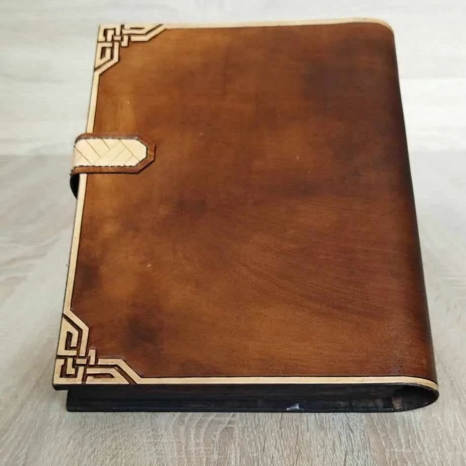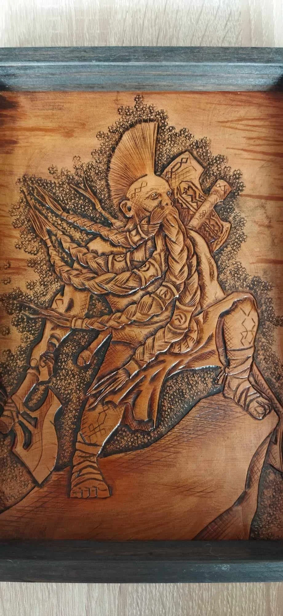 Closed dice rolling tray made of pine wood, plywood and leather. Dwarven style pattern on leather dice rolling section and on the lid is fully hand carved and dyed. Feel free to message me if You need any custom pattern or size made just for You.